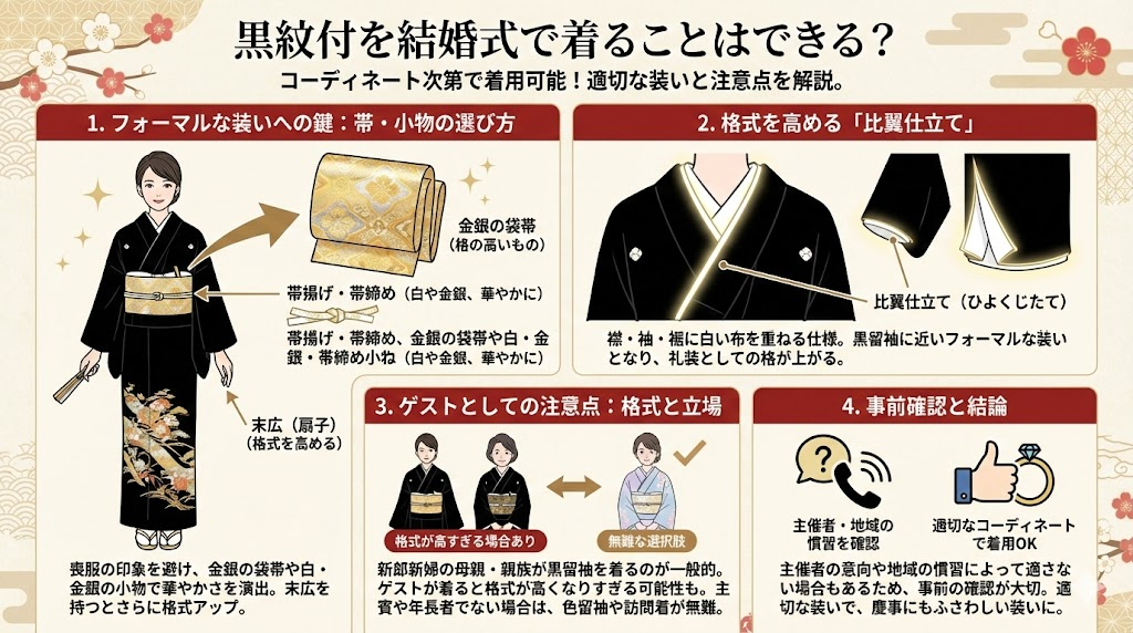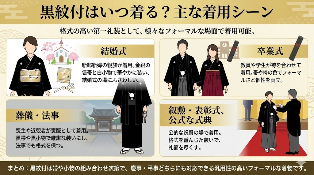 黒紋付は、そのコーディネート次第で慶事にもふさわしい装いになりますが、格式の高さや喪服のイメージを考慮し、適切な場面で着用することが重要です。