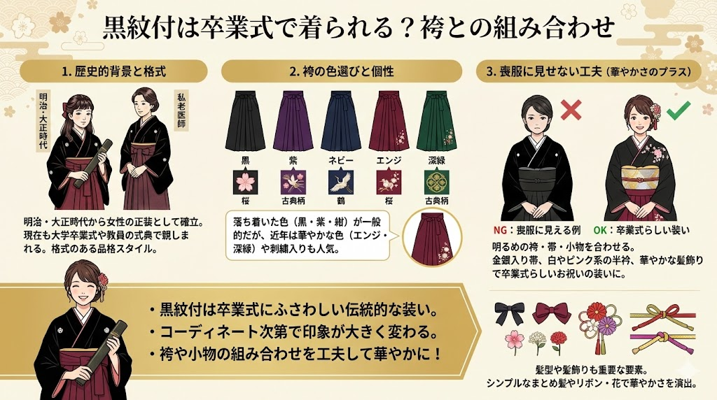 黒紋付は卒業式にふさわしい伝統的な装いですが、コーディネートによって印象が大きく変わるため、袴や小物の組み合わせに工夫を凝らすことが大切です。