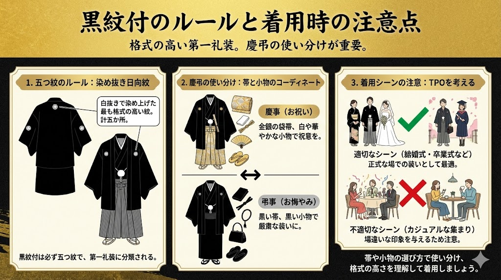 黒紋付は格式の高い着物であり、着用する際にはいくつかのルールや注意点があります。特に、黒紋付は紋の入れ方や帯の選び方によって慶弔両方に使われるため、その使い分けが重要です。