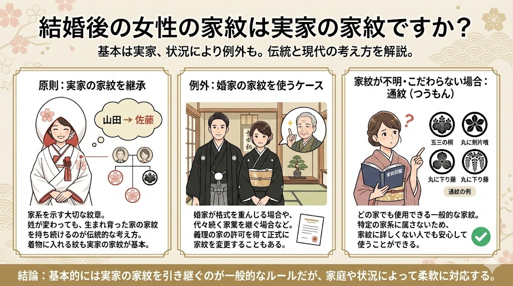結婚後の女性の家紋は、実家の家紋を引き継ぐのが一般的です。ただし、例外もあり、地域や家庭の考え方によって異なる場合があります。