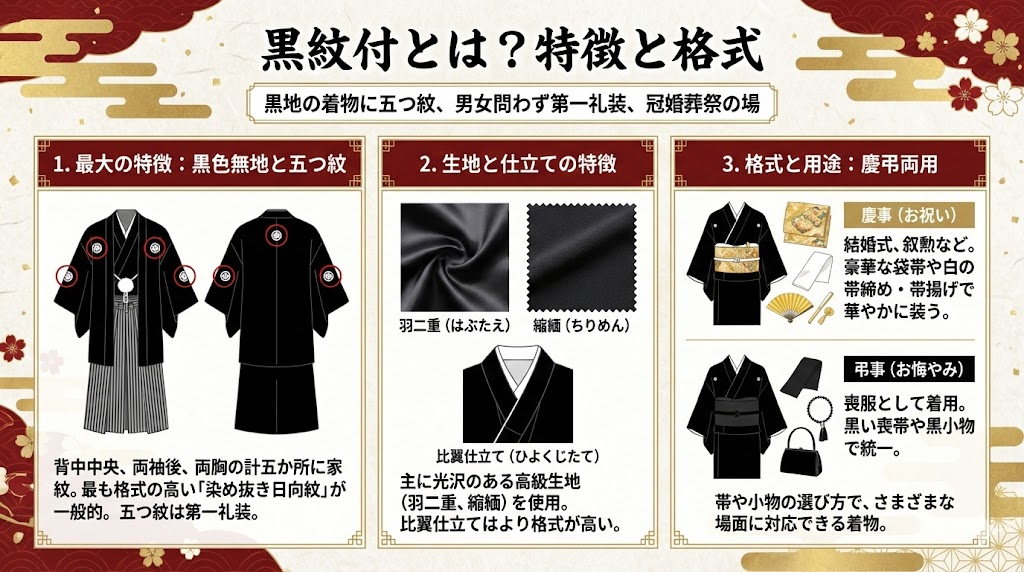 この章では、黒紋付の基本的な特徴や格式、具体的な着用シーンについて詳しく解説します。