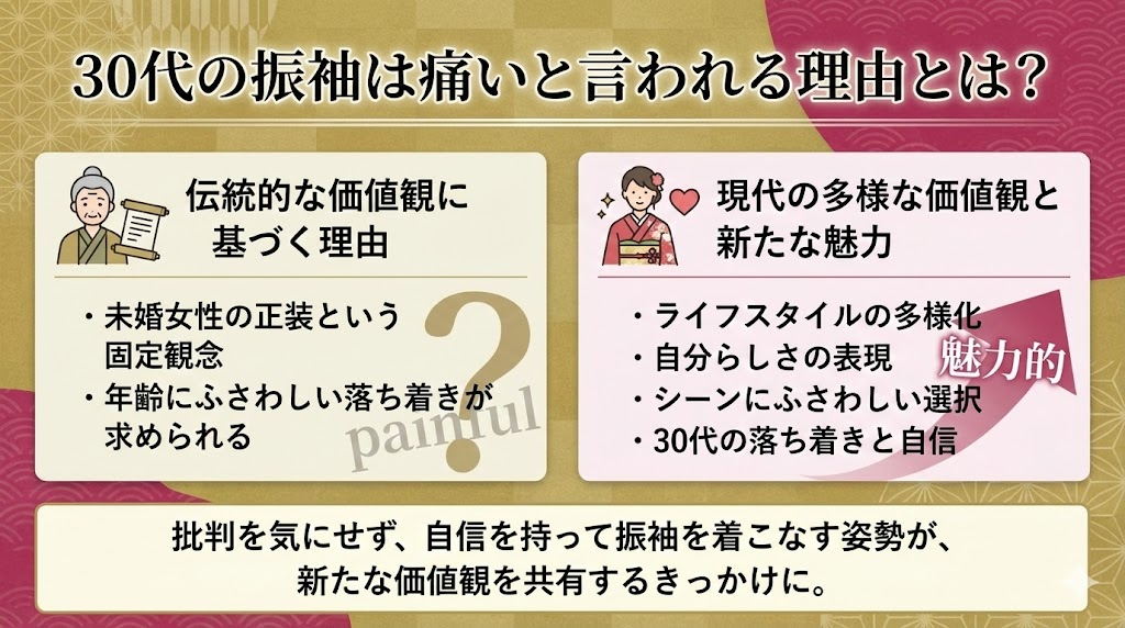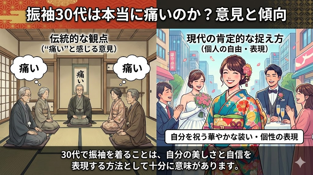 「30代で振袖を着るのは痛い」と言われる理由は、主に伝統的な価値観に基づくものです。しかし、個人のライフスタイルが多様化した現代では、この考え方も徐々に変わりつつあります。自分らしさを大切にし、シーンにふさわしい振袖を選ぶことで、そのような批判を気にせず楽しむことができます。30代だからこそ持つ落ち着きと自信を、振袖を通じて表現することは、非常に魅力的な選択です。また、周囲に対しても自信を持って振袖を着こなす姿勢を見せることで、新たな価値観を共有するきっかけとなるでしょう。