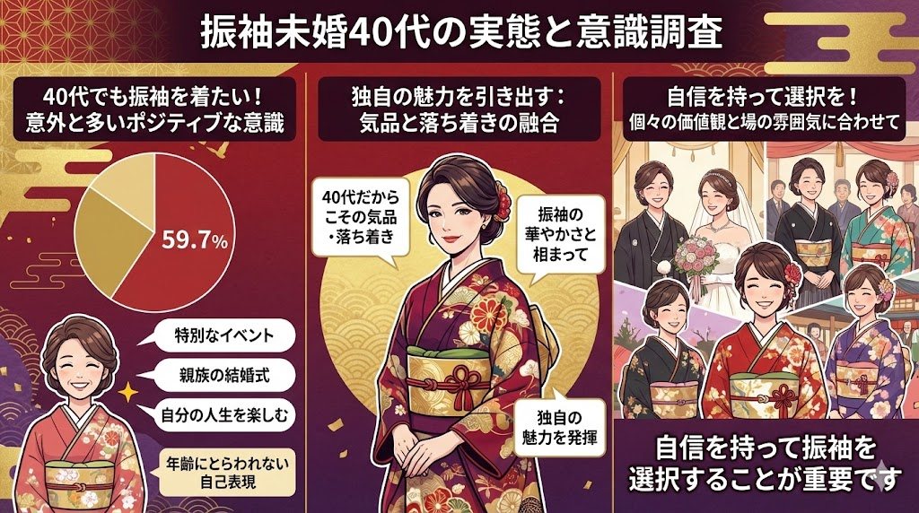 40代で未婚の場合でも振袖を着ることに対する意識はさまざまです。最近の意識調査によると、40代でも振袖を着たいと考える人は意外と多く、特に特別なイベントや親族の結婚式などでは好んで選ぶ傾向にあります。自分の人生を楽しむために振袖を選ぶことは、年齢にとらわれない自己表現の一環と考える人が増えています。また、40代だからこそ持つ気品や落ち着きが振袖の華やかさと相まって、独自の魅力を引き出すことができます。個々の価値観や場の雰囲気に合わせて、自信を持って振袖を選択することが重要です。