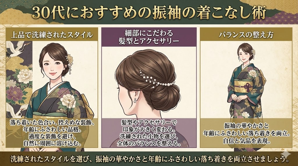 30代で振袖を着る際には、年齢にふさわしいスタイルやアクセサリーの選び方がポイントになります。過度な装飾を避け、上品で洗練された着こなしを目指すことで、自然に周囲に溶け込むことができます。髪型やアクセサリーの選び方によって全体の印象が大きく変わるため、細部にこだわりながらバランスを整えることが求められます。洗練されたスタイルを選ぶことで、振袖の華やかさと年齢にふさわしい落ち着きを両立させることができます。