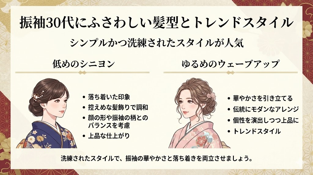 振袖に合わせる髪型として、30代にはシンプルかつ洗練されたスタイルが好まれます。例えば、低めのシニヨンやゆるめのウェーブを取り入れたアップスタイルが人気です。これにより、振袖の華やかさを引き立てながらも、落ち着いた印象を与えることができます。また、髪飾りも控えめなものを選ぶことで、全体の調和を保ちます。髪型は顔の形や振袖の柄とのバランスを考慮して選ぶと、より一層美しい印象を作り出すことができます。近年では、伝統的な髪型にモダンなアレンジを加えるスタイルも人気で、個性を演出しつつも上品な仕上がりを目指せます。