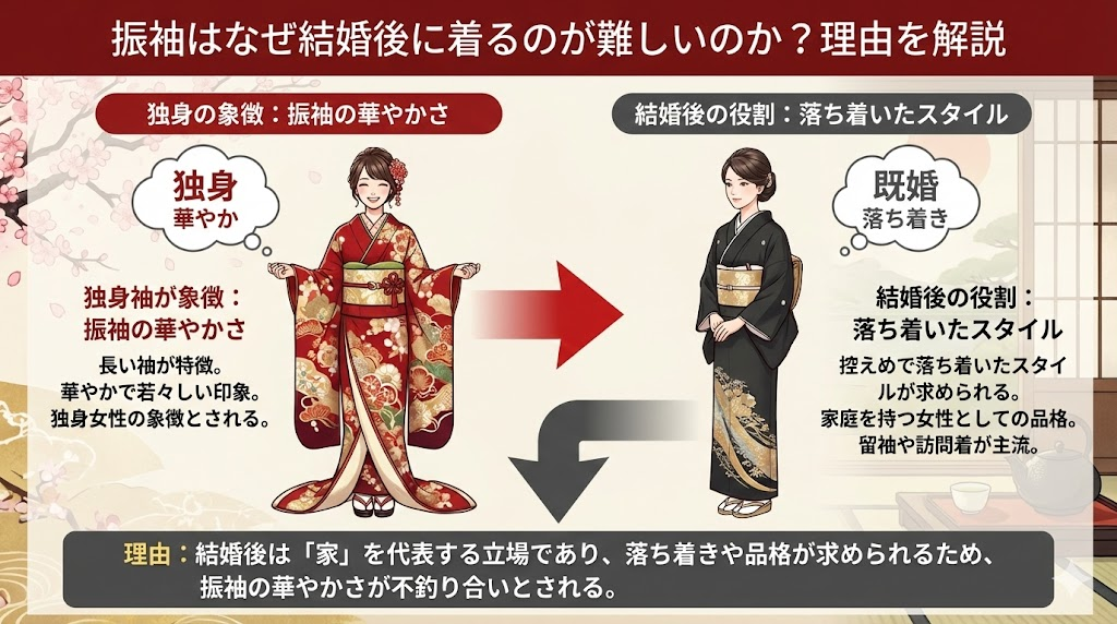 振袖は一般的に「未婚女性のための正装」とされており、婚姻後には着る機会が少なくなるのが通例です。ここでは、その理由と、既婚者にふさわしい代替の着物について説明します。振袖の華やかさは未婚女性の象徴とされるため、結婚後は控えめなデザインの着物に切り替えることが一般的です。