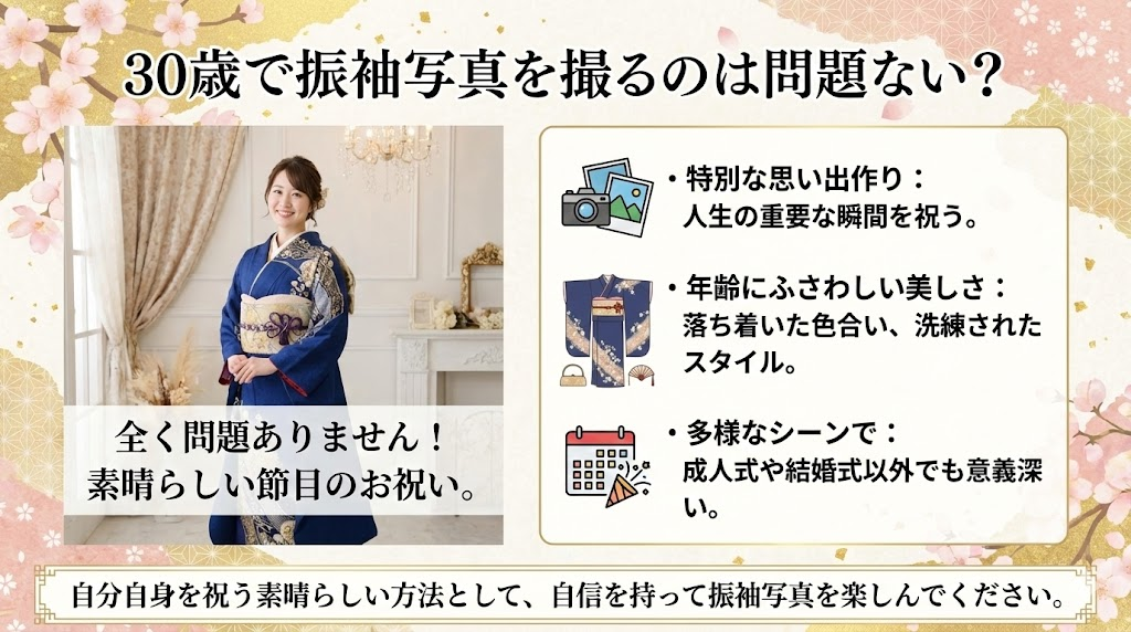 30歳で振袖を着て記念写真を撮ることは全く問題ありません。むしろ、節目の年齢として、自分自身を祝う素晴らしい方法と言えます。振袖を着ることで、特別な思い出を作ることができます。また、成人式や結婚式以外でも、自分の人生の重要な瞬間を祝うために振袖を選ぶことは、非常に意義深いことです。撮影の際には、落ち着いた色合いや洗練されたスタイルを選ぶことで、年齢にふさわしい美しさを引き立てることができます。