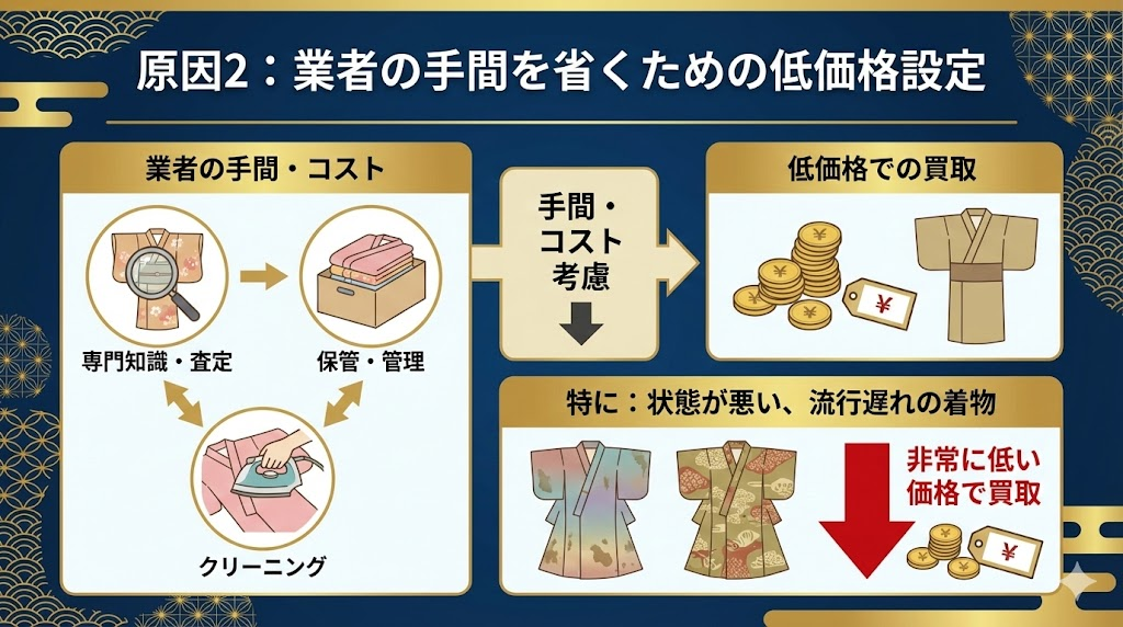 着物の場合、査定に専門知識が必要で、また保管やクリーニングにも手間とコストがかかります。これらの手間を考慮し、業者は低価格での買取を選択することがあります。