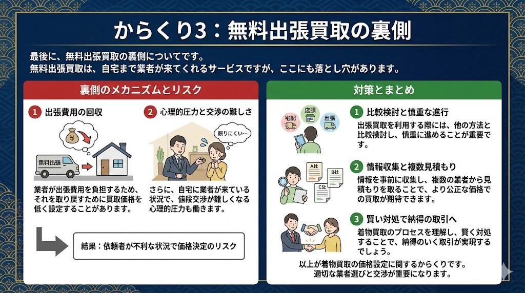 最後に、無料出張買取の裏側についてです。無料出張買取は、自宅まで業者が来てくれるサービスですが、ここにも落とし穴があります。