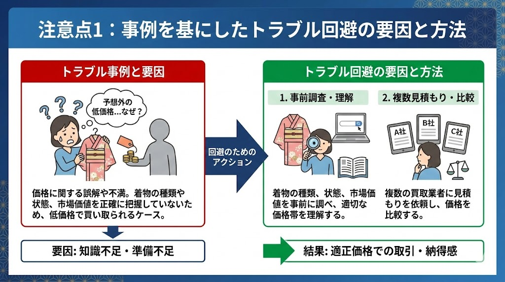 ここでは、着物買取におけるトラブルの原因とその回避方法について、具体的に解説していきましょう。