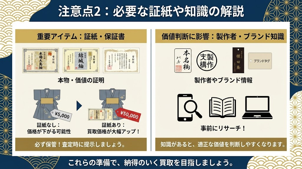 着物買取において重要なのは、証紙や保証書などの付属品の有無です。