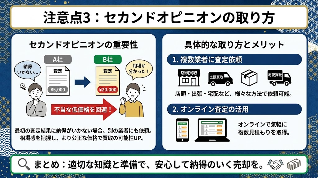 セカンドオピニオンを取ることは、不当な低価格での買取を避けるために非常に有効です。具体的には、最初の査定結果に納得がいかない場合、別の買取業者にも査定を依頼することをおすすめします。