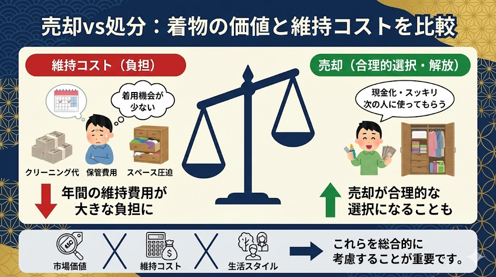 着物の売却を考える際には、その着物の市場価値、維持コスト、そして自身の生活スタイルを総合的に考慮することが重要です。