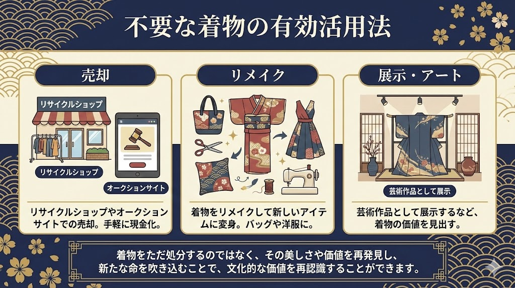 例えば、リサイクルショップやオークションサイトでの売却、着物をリメイクして新しいアイテムに変身させる、または芸術作品として展示するなど、着物の価値を見出す新しい視点が求められます。