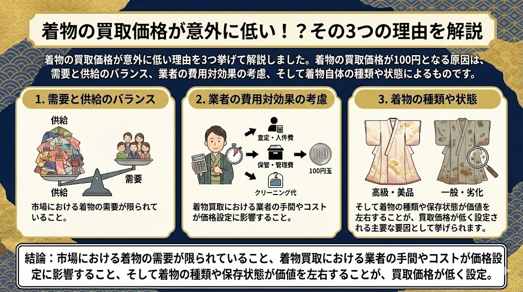 実は着物の買取価格が予想外に低いことがあります。この現象の背景には、市場の需要と供給のバランス、業者の運営コスト、そして着物自体の種類や状態といった複数の要因が関わっています。