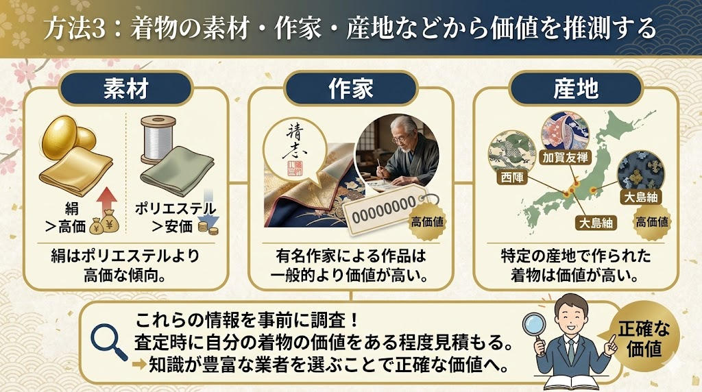 - 方法3:着物の素材・作家・産地などから価値を推測する