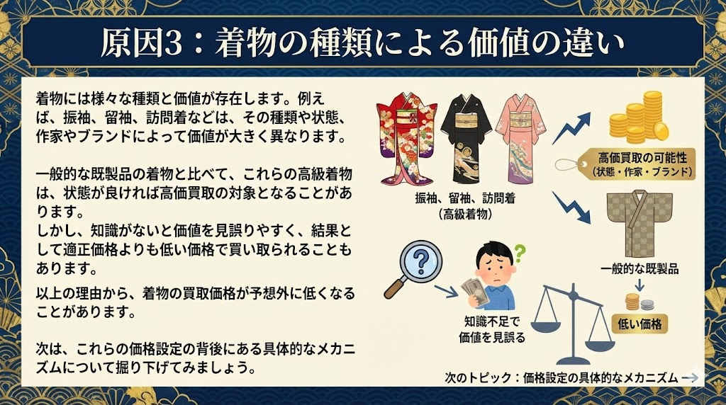 着物買取で意外と知られていないのが、価格設定の背後にある「からくり」です。多くの方が不満を抱える着物買取の低価格には、実はいくつかの理由が隠されています。