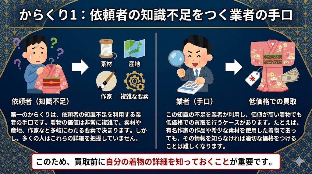 第一のからくりは、依頼者の知識不足を利用する業者の手口です。着物の価値は非常に複雑で、素材や産地、作家など多岐にわたる要素で決まります。