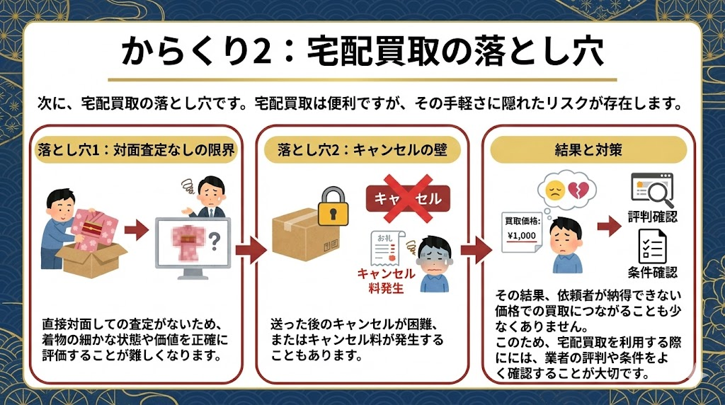 宅配買取は便利ですが、その手軽さに隠れたリスクが存在します。宅配買取では、直接対面しての査定がないため、着物の細かな状態や価値を正確に評価することが難しくなります。