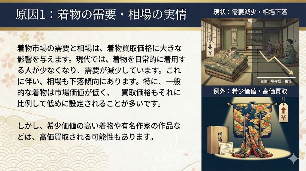 市場における着物の需要が限られていること、着物買取における業者の手間やコストが価格設定に影響すること、そして着物の種類や保存状態が価値を左右することが、買取価格が低く設定される主要な要因として挙げられます。