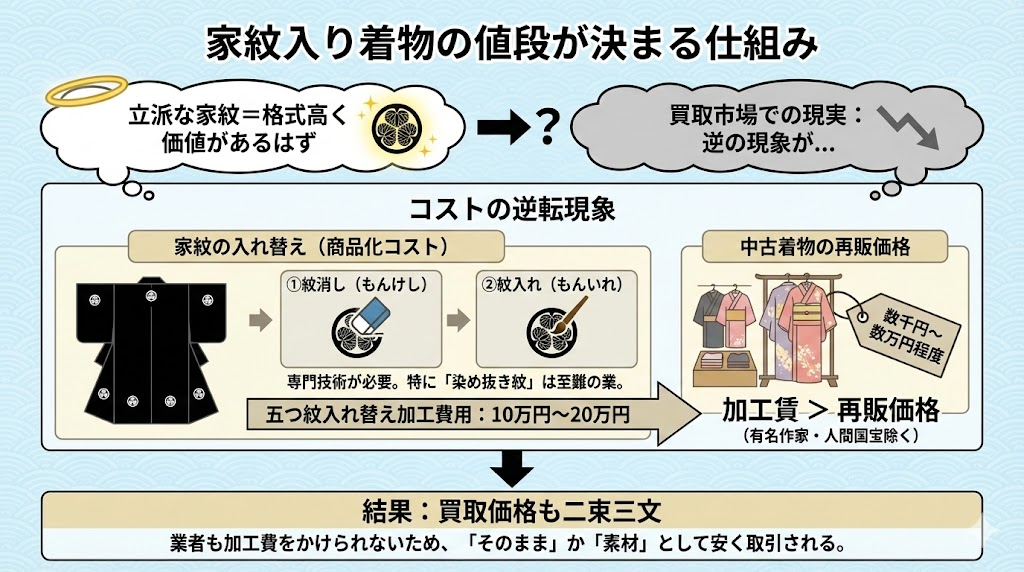 「立派な家紋が入っているからこそ、格式が高くて価値があるはずだ」と考える方もいらっしゃいますが、買取市場では残念ながら逆の現象が起きています。これは、中古着物を商品化して次に販売するために必要な「コスト」の問題が大きく関係しています。