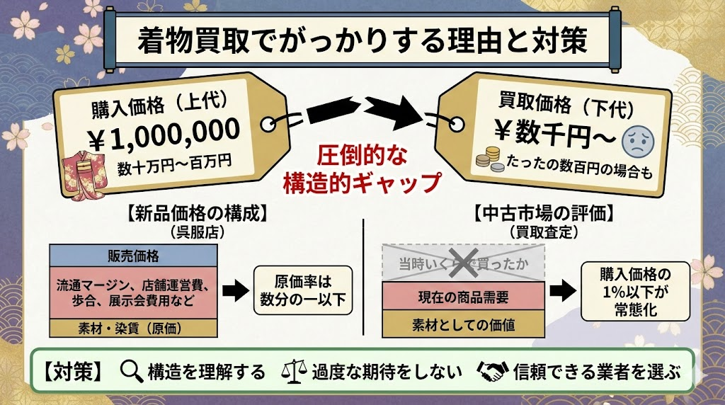 「数十万円、いや百万円近く出して誂えた着物が、たったの数百円だった」「もしかして騙されているんじゃないか?」という話を聞いて、着物買取に不信感や「がっかり」した経験を持つ方は少なくありません。この落胆の正体は、購入価格(上代)と買取価格(下代)の間に存在する、着物業界特有の圧倒的な構造的ギャップにあります。