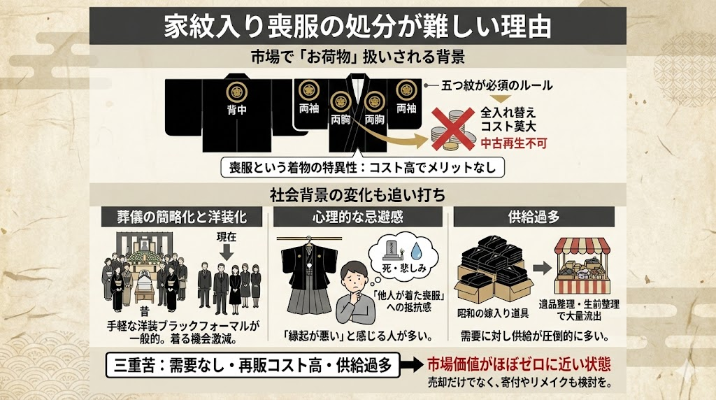 数ある着物の中でも、特に処分が難しく、買取市場で「お荷物」扱いされてしまいがちなのが「家紋入りの喪服(黒紋付)」です。どの家庭にも一着はあるものですが、なぜこれほどまでに売れないのでしょうか。