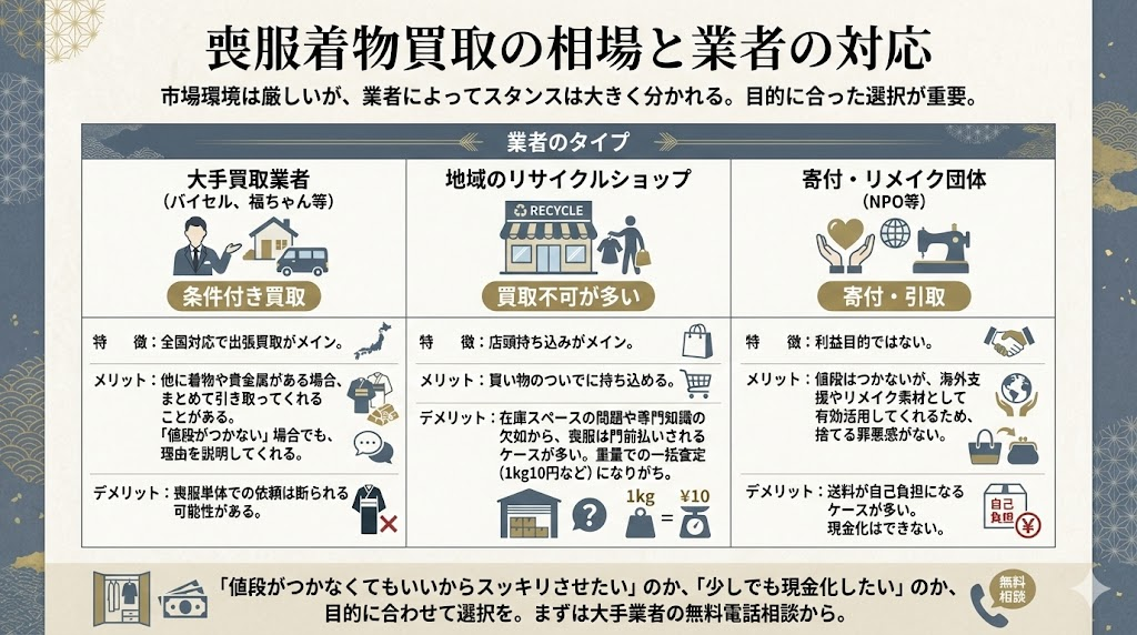 喪服着物買取の市場環境は冷え込んでいますが、業者によってスタンスや対応は大きく分かれます。「どこに出しても同じ」と思わず、自分の目的に合った業者を選ぶことが重要です。大きく分けて以下の3つのパターンがあります。