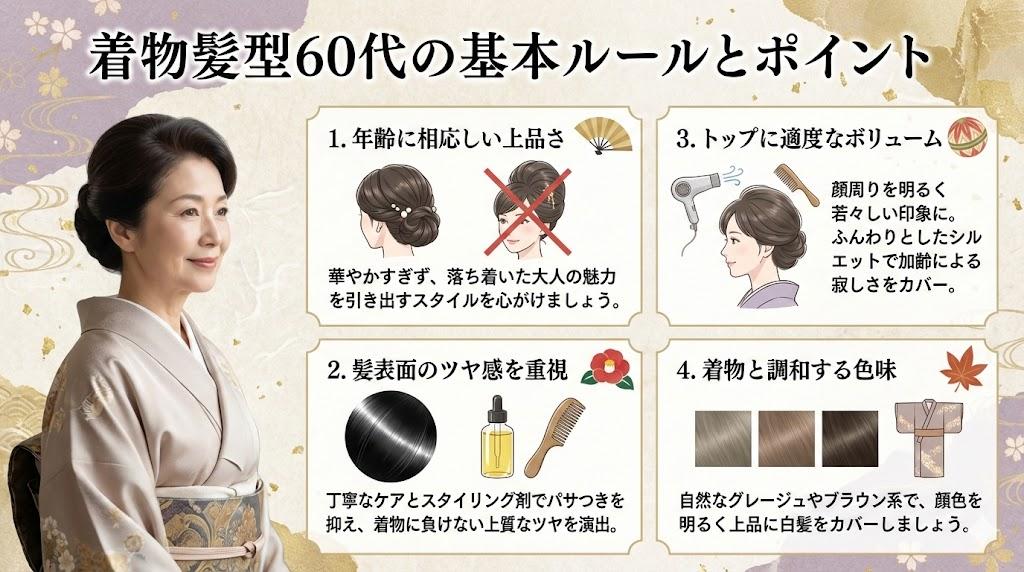 着物を美しく着こなすためには、髪型選びが非常に重要な要素となります。特に60代の女性がショートヘアで着物を着る場合、年齢に応じた上品さと華やかさを両立させることが求められます。ここでは、基本的なルールから実践的なアレンジ方法まで、幅広くご紹介していきます。