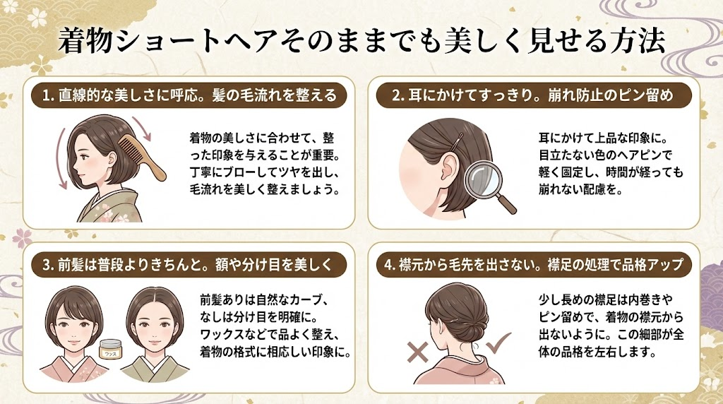 ショートヘアの方が着物を着る際、特別なアレンジを加えなくても、いくつかのポイントを意識するだけで格段に美しい仕上がりを実現できます。まず重要なのは、髪の毛流れを整えることです。着物は直線的な美しさを持つ衣装であるため、髪型もその美しさに呼応するよう、きちんと整った印象を与える必要があります。