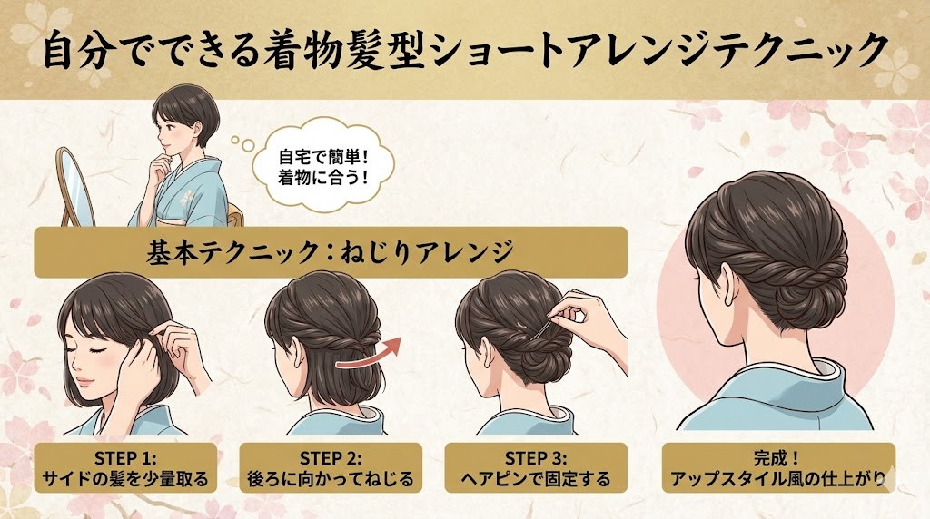 ショートヘアの方でも、自宅で簡単にできるアレンジテクニックを身につけることで、着物にふさわしい髪型を作ることができます。最も基本的で効果的なテクニックは、ねじりアレンジです。サイドの髪を少量ずつ取り、後ろに向かってねじりながらヘアピンで固定することで、アップスタイル風の仕上がりを実現できます。