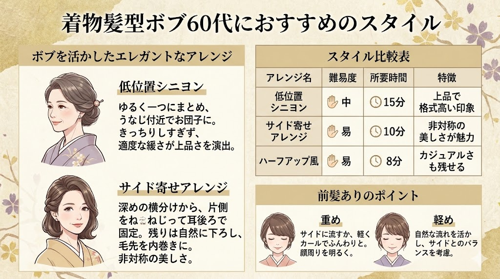 ボブスタイルの60代女性が着物を着る場合、髪の長さを活かしたエレガントなアレンジが可能です。ボブは一般的にあごラインから肩上までの長さを指し、この長さがあることで、ショートヘアよりも多様なスタイリングができる利点があります。