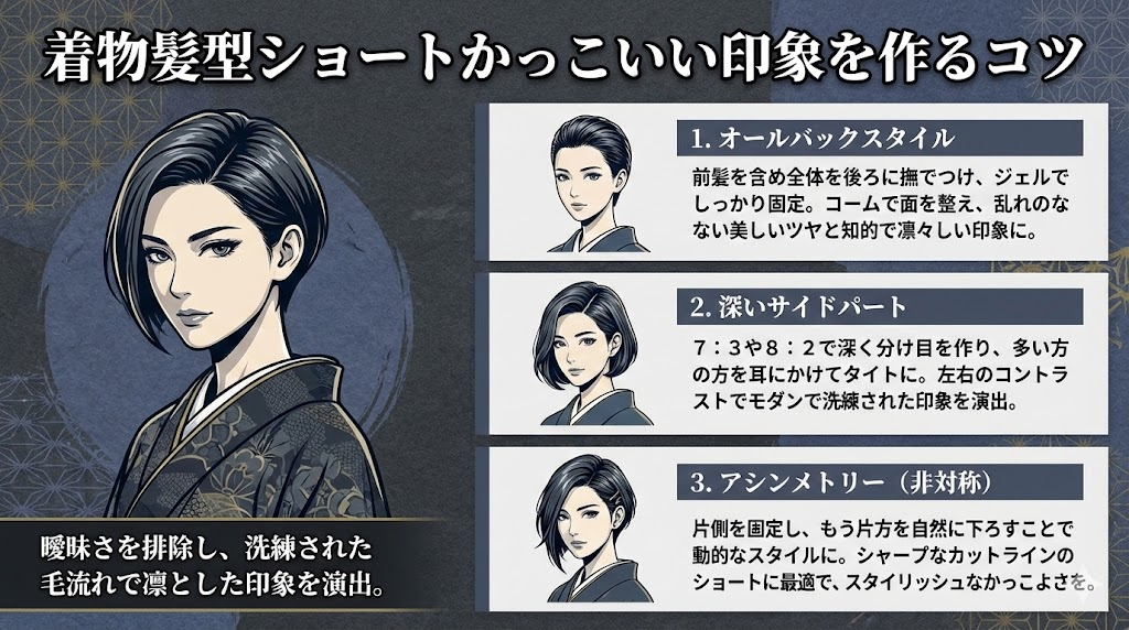 ショートヘアで着物を着た際に、可愛らしさよりもかっこいい印象を目指したい場合、いくつかの特別なテクニックがあります。まず重要なのは、髪の毛流れをはっきりと作ることです。曖昧でふんわりとしたスタイルではなく、意図的で洗練された毛流れを意識することで、凛とした印象を演出できます。