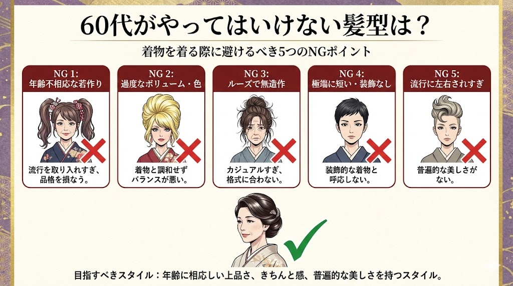 60代の女性が着物を着る際に避けるべき髪型には、いくつかの共通点があります。まず最も注意すべきは、年齢に不相応な若作りスタイルです。20代や30代の流行を取り入れすぎた髪型は、かえって年齢を強調してしまい、品格を損なう可能性があります。