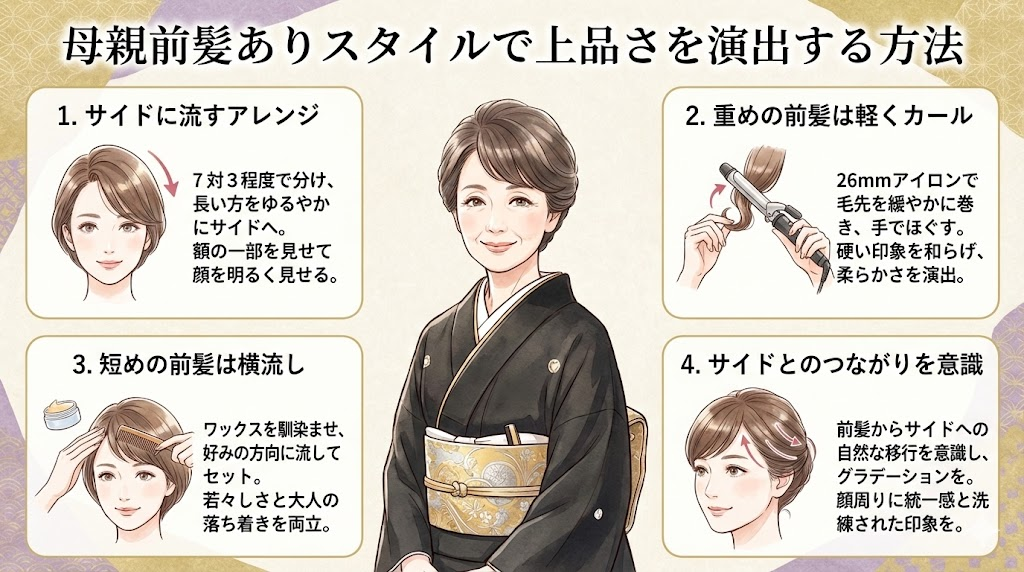 前髪があるショートヘアの60代女性が母親として留袖を着用する場合、前髪の処理方法が全体の印象を大きく左右します。適切な前髪スタイリングにより、年齢に相応しい上品さと、母親としての威厳を両立させることができます。