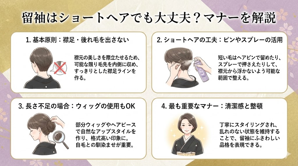 - ショートヘアでも留袖着用は可能だが襟足の処理など細部への配慮が必要