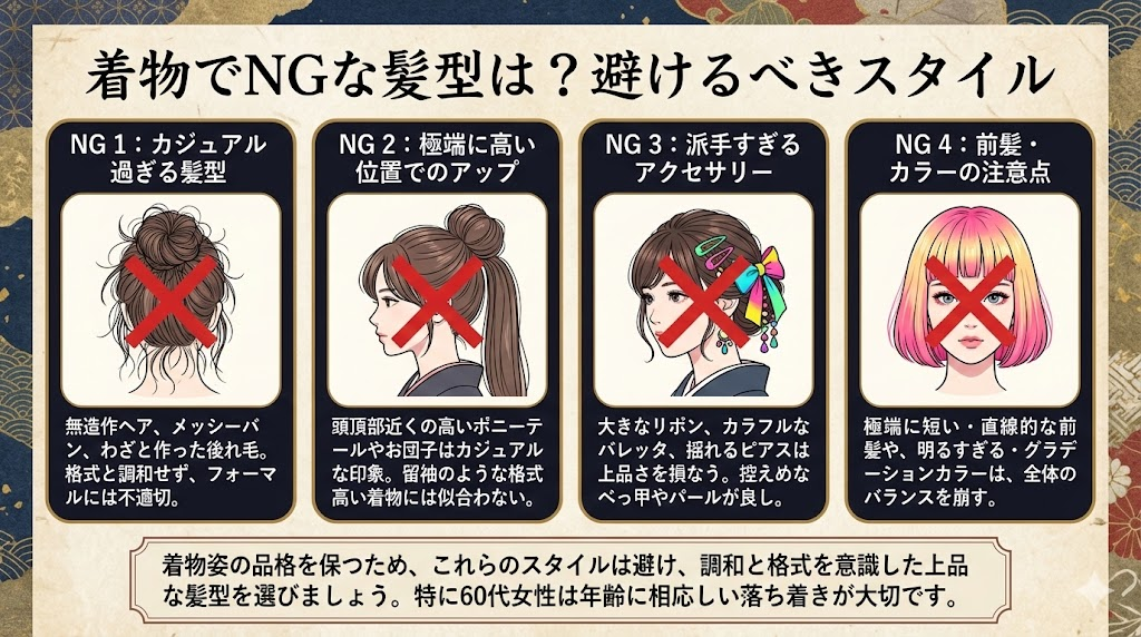 極端に高い位置でのアップスタイルも避けるべきです。頭頂部近くで髪をまとめる高いポニーテールやお団子は、カジュアルな印象が強く、留袖のような格式高い着物には似合いません。また、若い世代向けのスタイルという印象も与えるため、60代女性には特に注意が必要です。