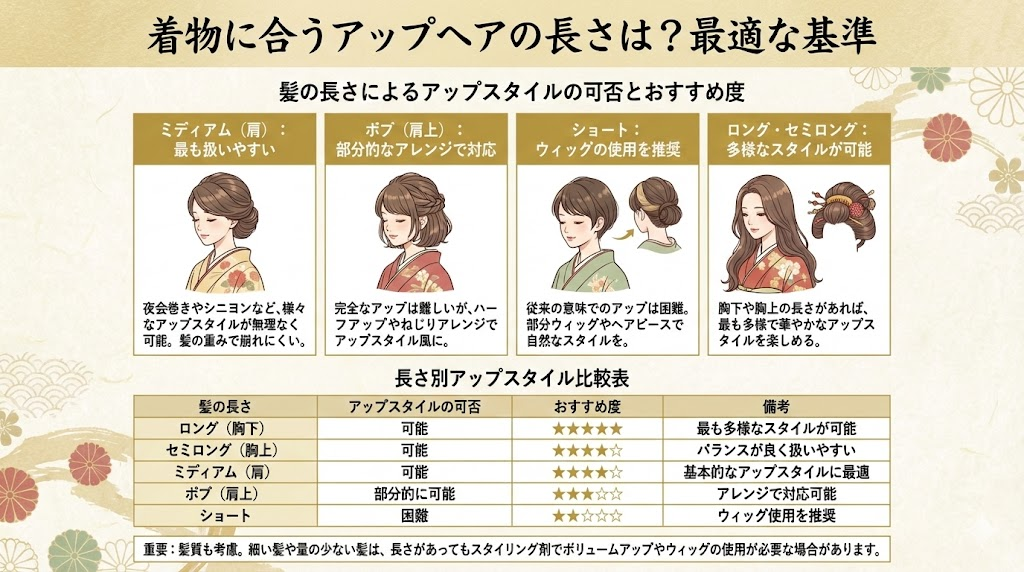 着物に適したアップヘアを作るための髪の長さには、ある程度の目安があります。一般的に、あごのラインよりも長い髪があれば、基本的なアップスタイルを作ることが可能とされています。しかし、理想的なアップヘアを作るためには、より具体的な長さの基準を理解することが重要です。