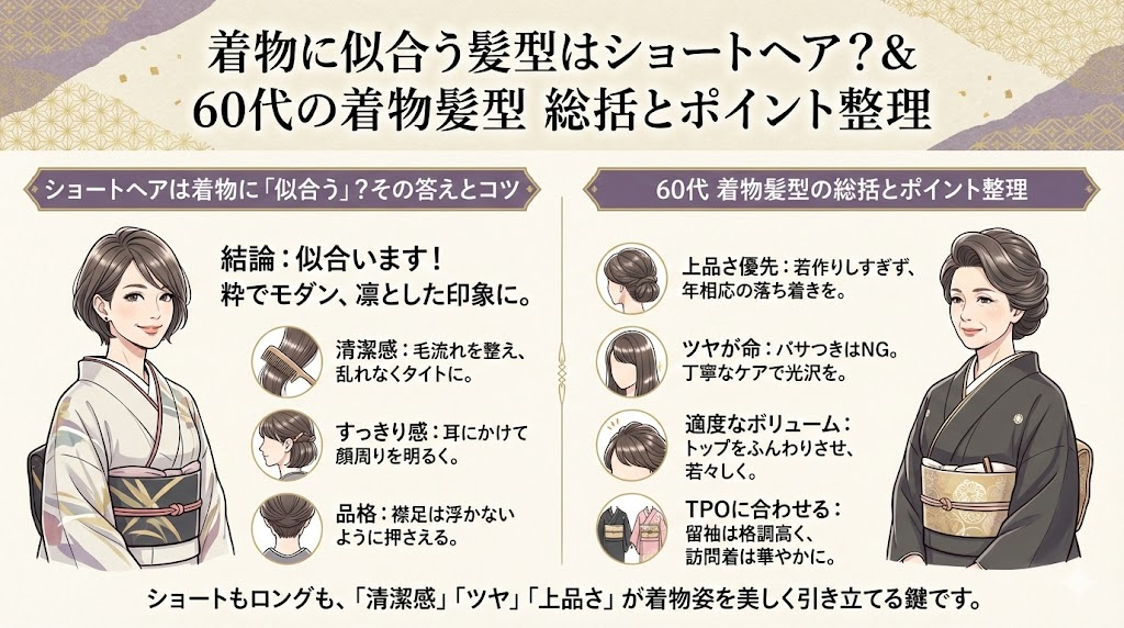 60代になって着物を着る機会が増えた時、どのような髪型にすればよいか迷われる方も多いのではないでしょうか。特にショートヘアの場合、着物に合う上品なスタイルを作るのは難しく感じるかもしれません。しかし、正しい知識とテクニックがあれば、ショートヘアでも美しく格式ある髪型を作ることができます。