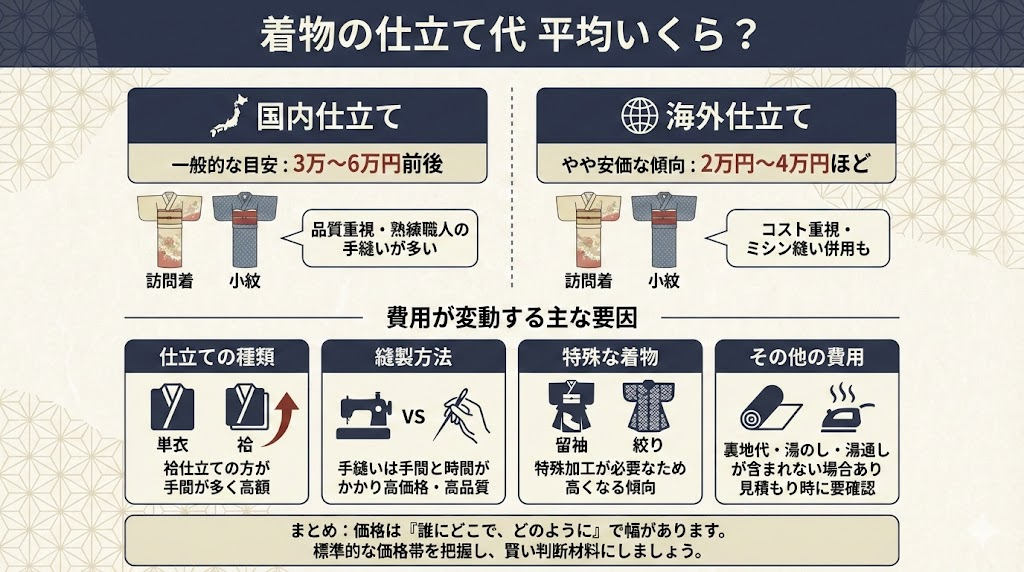 - 袷仕立てや手縫いは費用が高く、単衣仕立てやミシン縫いは比較的安価