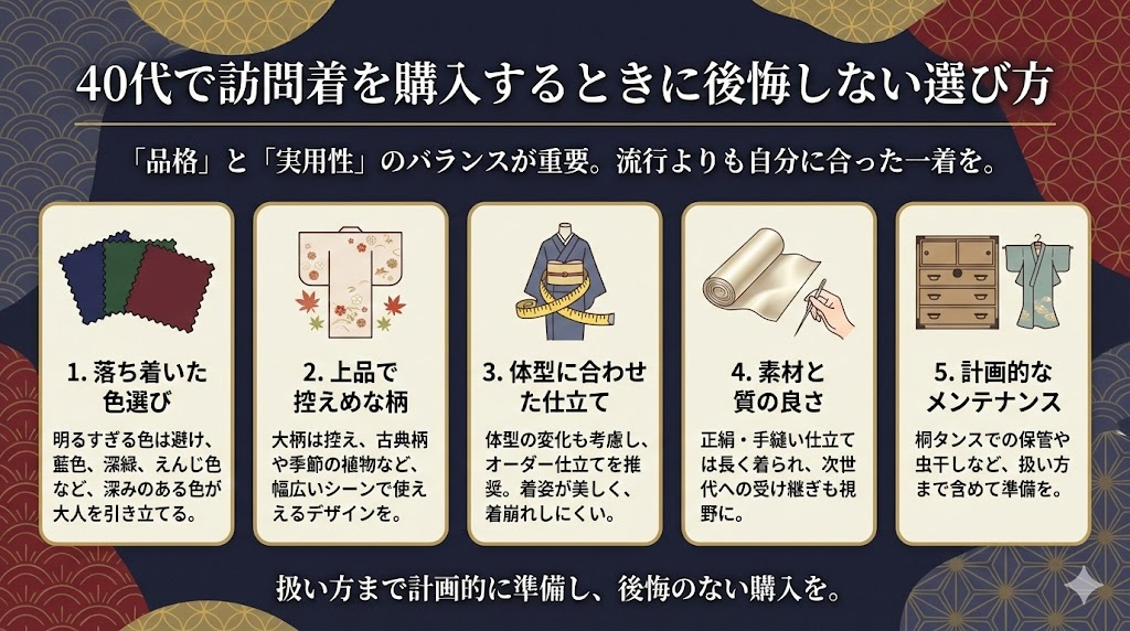 40代で訪問着を購入する場合、「品格」と「実用性」のバランスを取ることがとても重要です。この年代になると、フォーマルな場に出席する機会が増えると同時に、自分の好みやライフスタイルも確立されていることが多いため、流行よりも自分に合った一着を選ぶ視点が求められます。