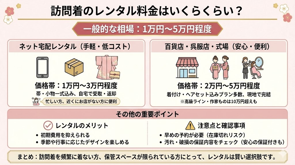 訪問着を頻繁に着ない方や、保管スペースが限られている方にとって、レンタルは賢い選択肢です。