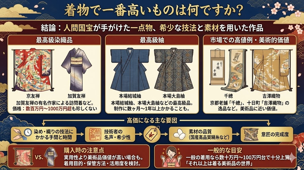 着物の中で最も高価なものとされるのは、「人間国宝が手がけた一点物」や「希少な技法と素材を用いた作品」です。とくに京友禅の手描き作品や、加賀友禅の有名作家による訪問着、あるいは本場結城紬や本場大島紬などの最高級品がその代表です。