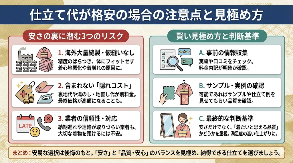 - 格安仕立てにはサイズ不一致や仕上がりの品質に注意が必要