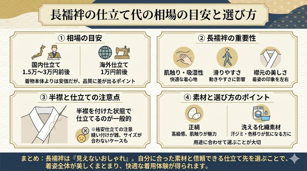 - 長襦袢の仕立て代は国内で1.5万〜3万円、海外で約1万円程度