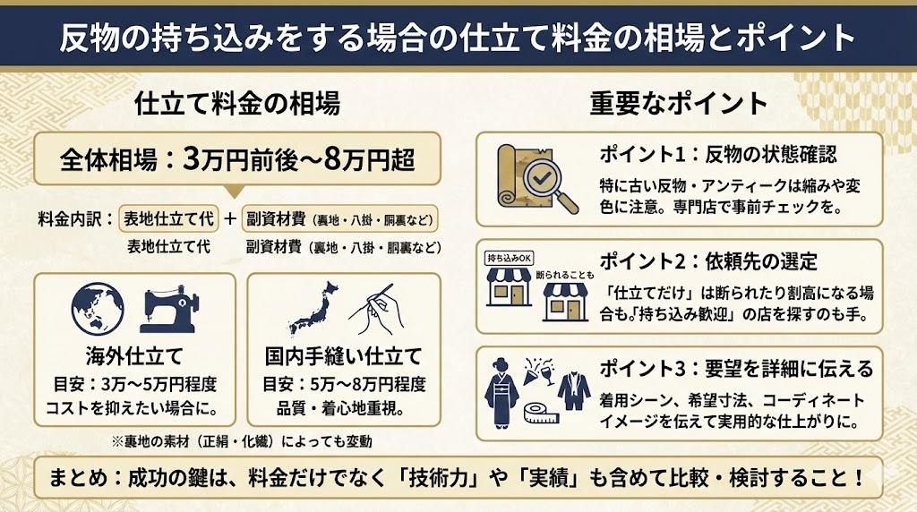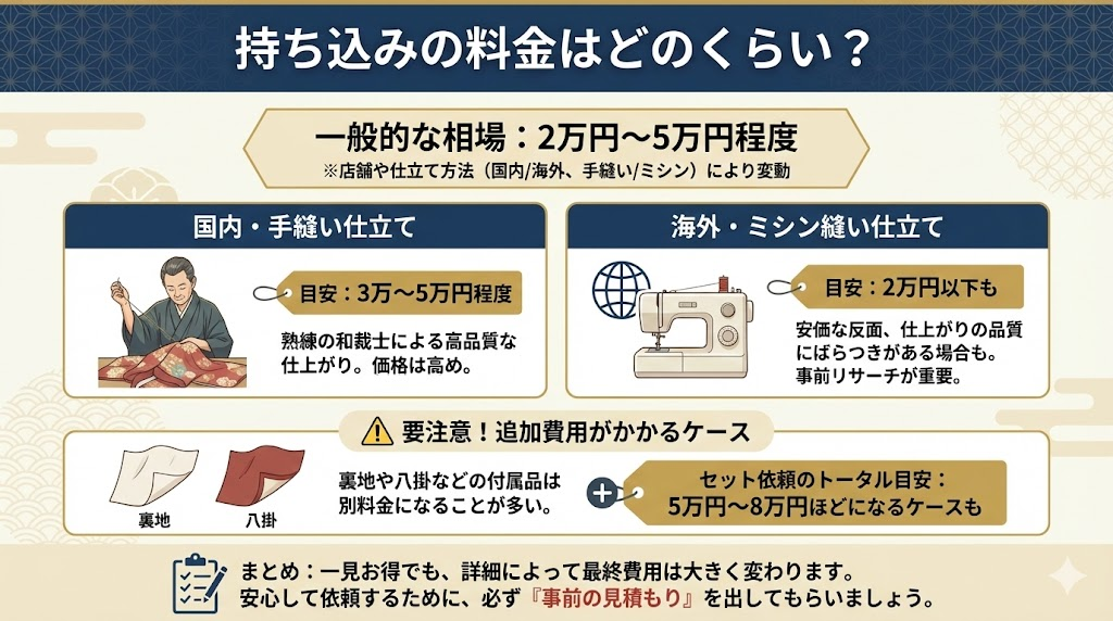 - 持ち込み仕立ての料金は一般的に2万〜5万円が目安