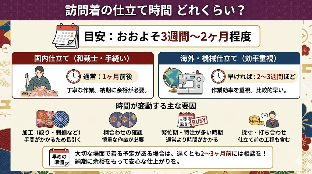 訪問着を仕立てる際にかかる時間は、依頼先や仕立て方法によって異なりますが、おおよそ3週間〜2ヶ月程度が目安です。特に繁忙期や特注が多い時期は、さらに時間がかかる可能性もあります。