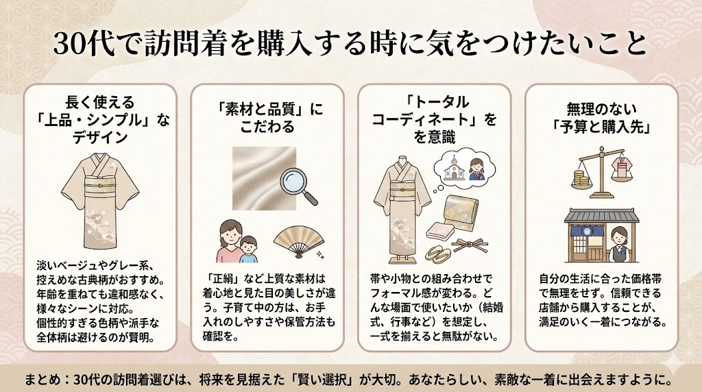 さらに、購入時には「正絹」など上質な素材を選ぶことで、着心地や見た目の美しさが格段に変わります。加えて、30代であれば子育て中の方も多いため、お手入れのしやすさや保管方法についても確認しておくと安心です。